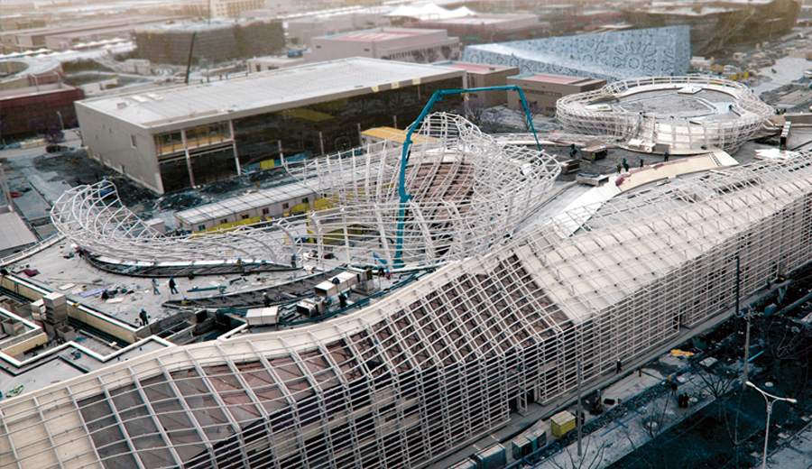 總用鋼量大,采用大量“S形”多曲率鋼管桁架,鋼管之間采用法蘭連接:框架采用弧形箱形梁